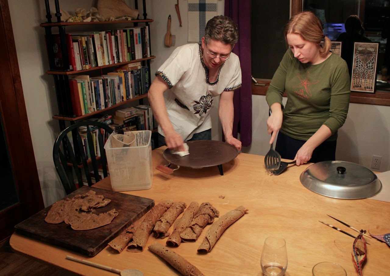 This year we celebrated Ethiopian Christmas by making our most extravagant Ethiopian meal yet. I have successfully made a couple of Ethiopian main dishes but have failed miserably at making injera (the spongy, fermented flat bread).